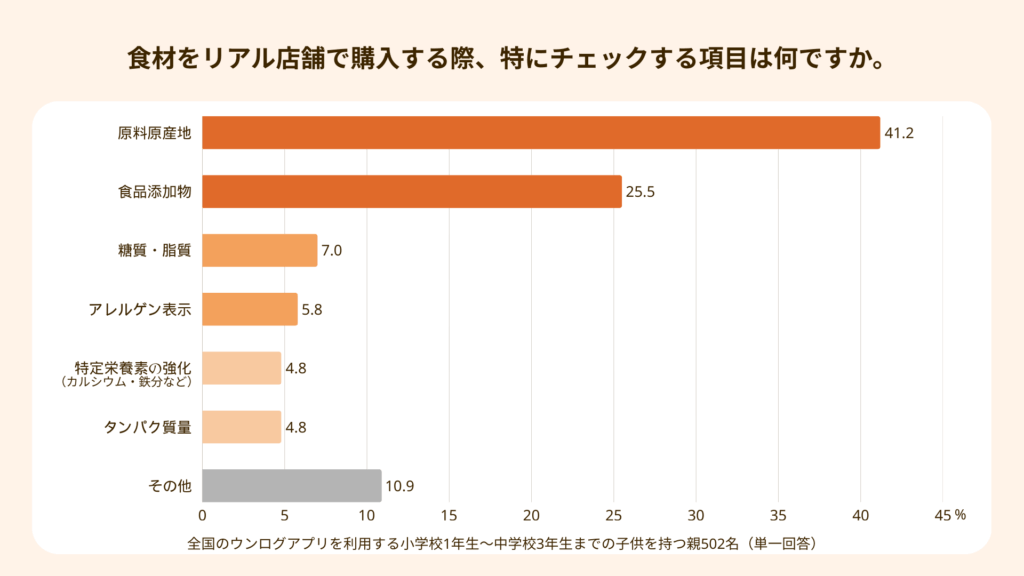 また、加工食品やお菓子においては、その傾向が顕著です。「子どもが食べるものだから、成分表を見て添加物はできる限り無いものを選ぶ」「海外産のグミが子供は好きだけど、着色料など不安が多く、与えないようにしている」といった声が挙がっており、自身の親世代からの影響を受け継ぎつつ、自身も知識を持って厳格にチェックを行っています。