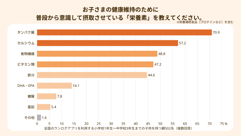 定量調査の結果、α世代の親が子どもの健康維持のために最も意識して摂取させている栄養素は『タンパク質』であることが明らかになりました。親世代の健康リテラシーの向上により、これまで重視されてきた「カルシウム(骨)」や「鉄分(貧血・メンタル)」に加え、それらの土台となる身体そのものをつくる栄養素として、『タンパク質』への関心が高まっています。