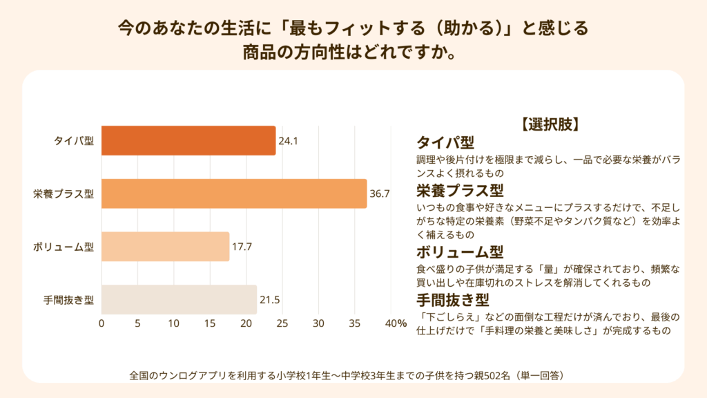 - 将来ニーズ:多忙な投資家(親)が求める商品、1位は「栄養プラス型」。