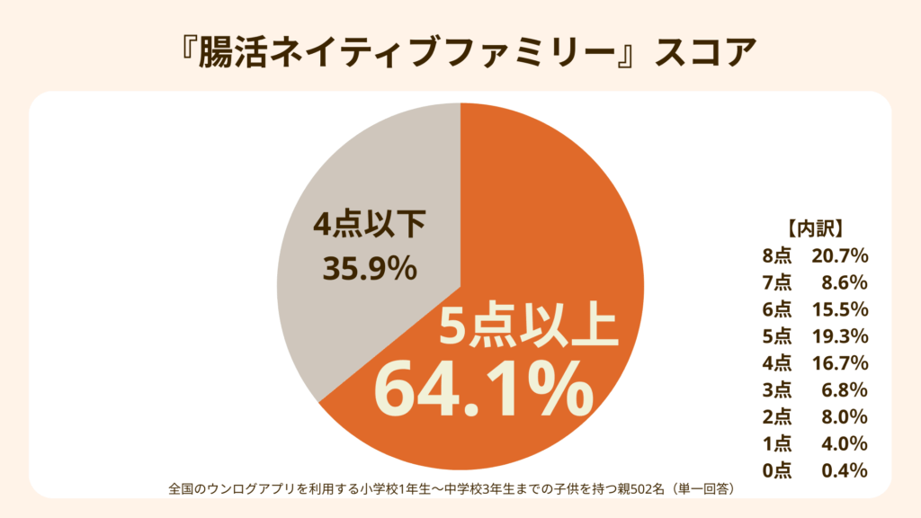 満点8点のうち、5点以上とした理由は、腸活を「知っている・やったことがある」段階を超え、自身の経験と理解を、子どもの日常的な健康管理に“当たり前”として転用している状態を明確に示すためです。